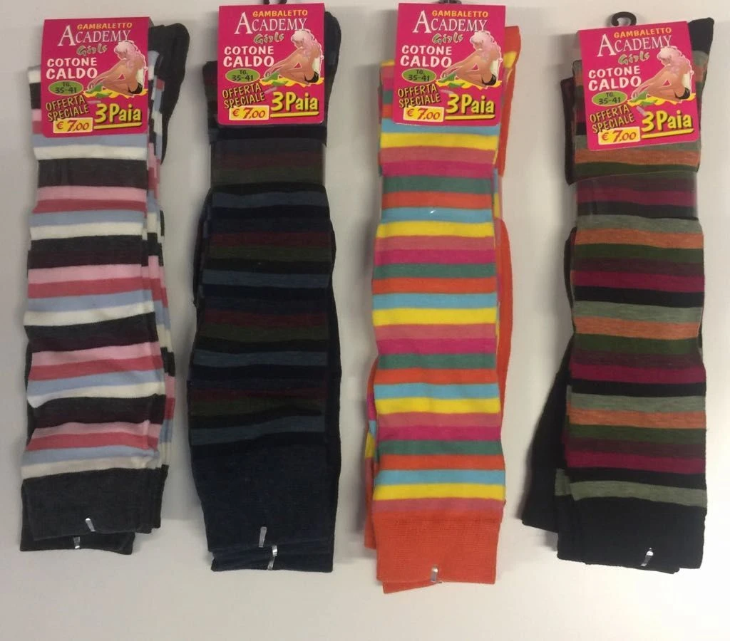 Calza Donna lunga gambaletto sotto al ginocchio Accademy by Carpenter caldo cotone invernale 95% cotone 5% elastam due paia rigati ed uno tinta unita