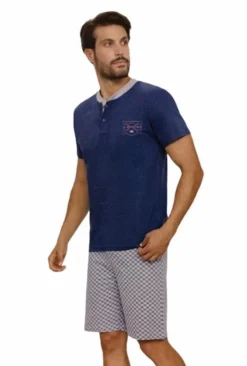 Offerta outlet Pigiama Uomo corto 100% cotone leggero estivo jersey naturale ed anallergico con maglia mezza manica fantasia cravatta piccola, aperta a serafino due bottone e pantalone corto tinta unita.