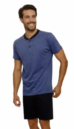 Offerta outlet Pigiama Uomo lungo 100% cotone leggero estivo jersey naturale ed anallergico con maglia manica lunga fantasia cravatta piccola con bordo in vita e polsini, aperta a serafino due bottone e pantalone lungo tinta unita con bordi alle caviglie.